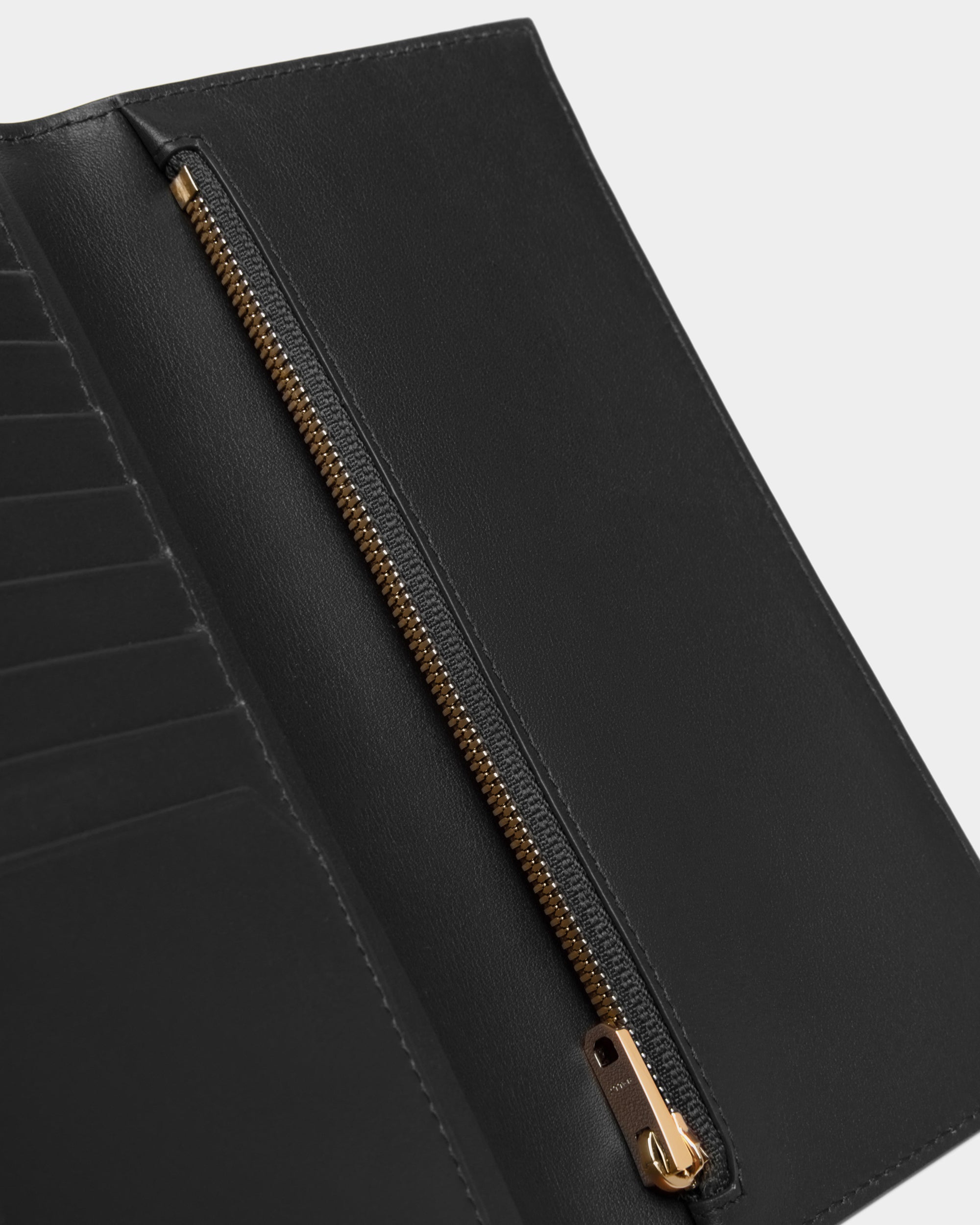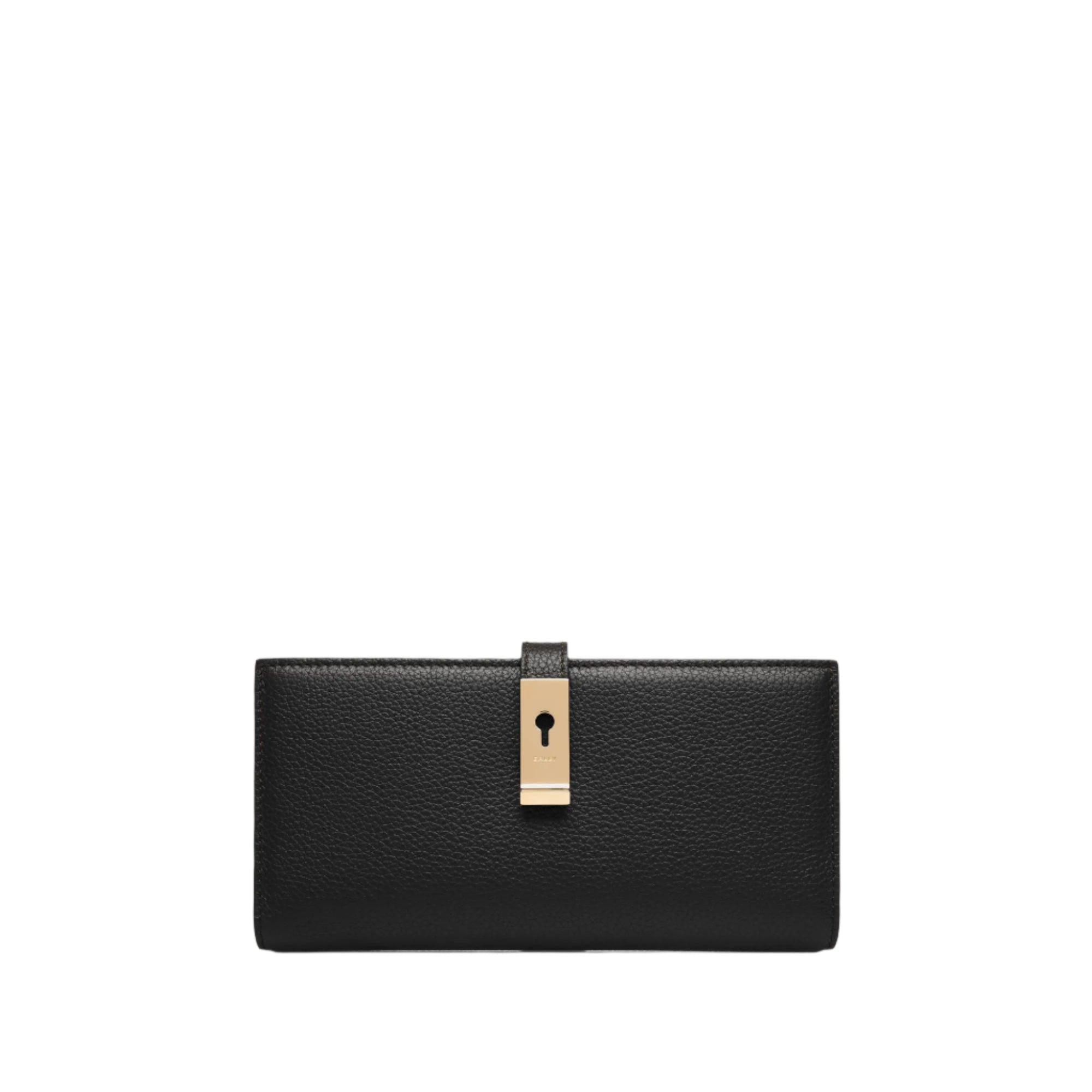 This Lock Me long wallet is crafted from grained leather. Its multiple compartments ensure optimal organization. A snapped strap keeps things secure, with gold-tone metal Lock Me hardware.