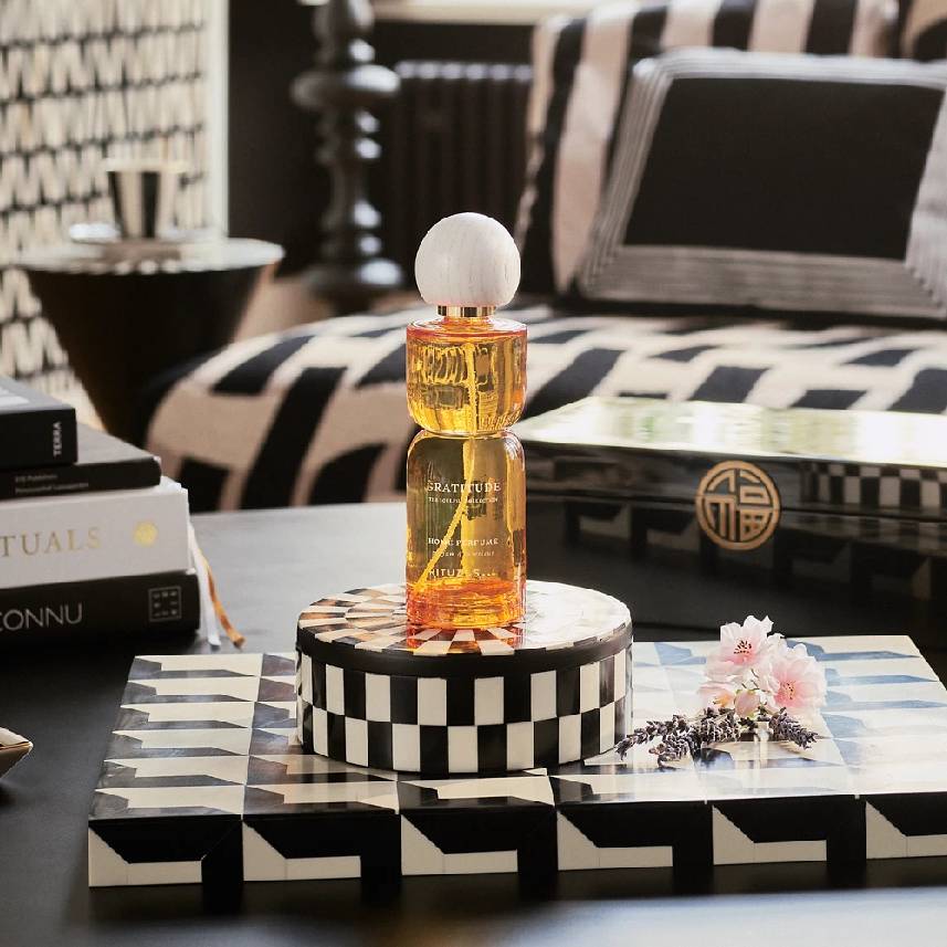 Instantly infuse the room with a warm and comforting fragrance with our exquisite new Gratitude home perfume from The Soulful Collection. Crafted by one of the world’s top perfumers, this addictive scent features a blend of peach, lavender and vanilla. This home perfume is suitable for all spaces, simply spritz for a luxurious olfactory experience. Packaged in a sophisticated amber glass bottle with a golden spray and shaped wooden cap, it will add a chic, elegant touch to your home decor.