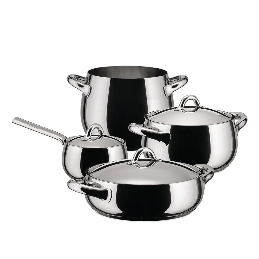 Created by the designer Stefano Giovannoni, this 18/10 stainless steel, glossy finish pots and pan set includes a stockpot, two casserole pans of varying size, a saucepan and three lids. Part of the Mami collection, these pans are a hymn to the soft and rounded shapes of the tools which make up the Italian tradition and from which the delicious scents of Sunday lunch for the whole family spread throughout the house.