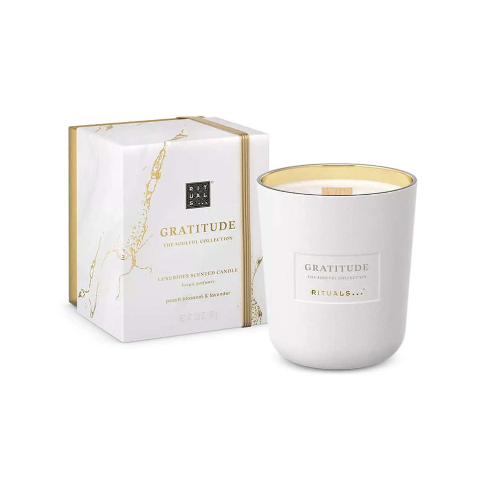 Infused with a one-of-a-kind fragrance created by one of the world’s top perfumers, this deluxe candle is a testament to the beauty of gratitude. With the warm and comforting scent of peach, lavender and vanilla, allow its gentle glow to be a reminder of the joy found in simple moments. This candle has a burning time of up to 60 hours. Enclosed in a protective cotton bag, this stunning design features a gold inner that reflects the candle's glow, a luxurious wooden wick that creates a gorgeous, larger shaped flame, plus, a new refillable style holder. This product is manufactured by Rituals under license from Lumetique, Inc. in compliance with all applicable design and patent rights