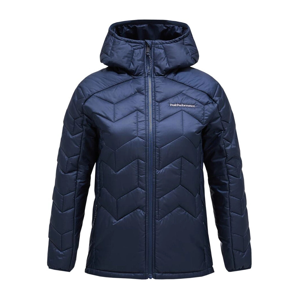 Adjustable drawcord at bottom hem, Body - 133 gr/m2, Chinguard, Elastic binding at cuffs, Fixed Hood, Full front with reversed YKK coil zipper, Hanger loop at back, Hood - 60 gr/m2, Lightweight recycled polyester ripstop, wind and water resistant, Made without intentionally added PFAS, One-way (width) adjustable hood, P-logo embroidery at sleeve, Peak Performance embroidery at chest, Quilted in P-logo pattern, Recycled fibers, Recycled insulation, Repair patch included, Synthetic sheet insulation., Zippered hand pockets