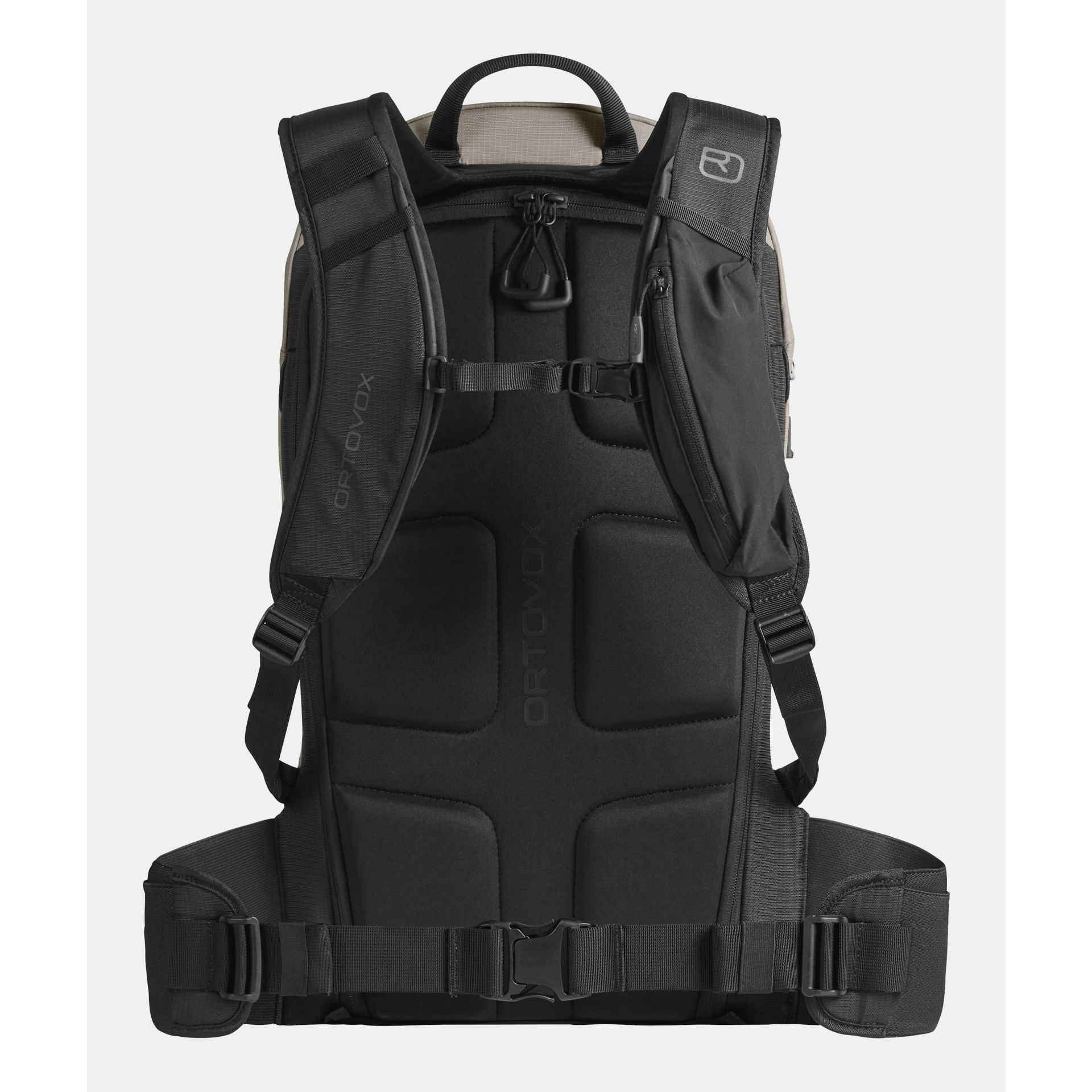 In order to optimally adjust the backpack while on the go, it can be quickly compressed using the integrated side straps and folded into a flat-fitting second skin on the back. When it comes to rappelling into steep gullies or short walking passages, this freeriding backpack has all the necessary attachment options for skis, an ice axe or rope, not to mention the tried-and-tested helmet net, emergency card and hydration system compatibility. All the features are well stowed away on the outside to prevent them catching, even when in difficult terrain.
