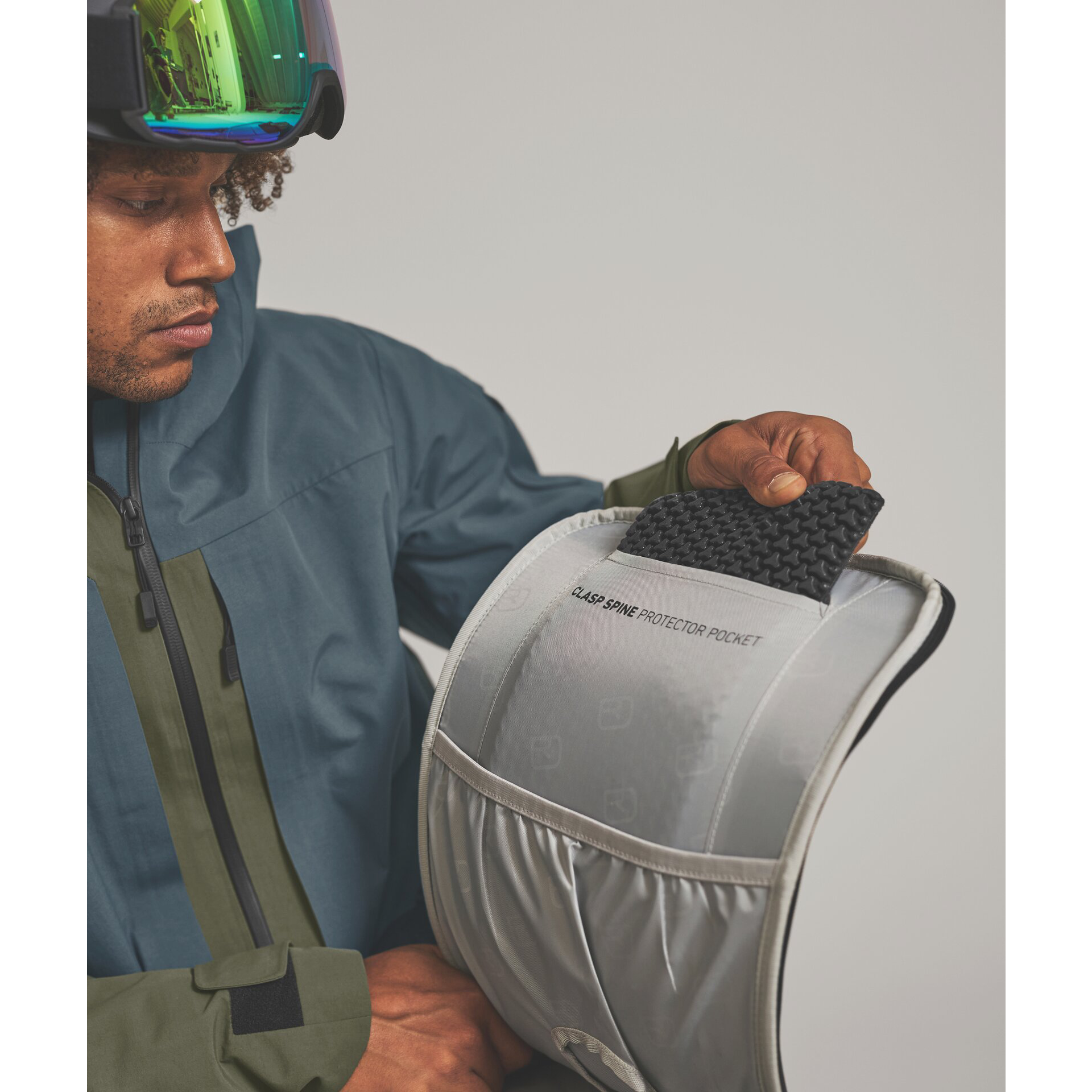 The FREE RIDER 22 fits extra snugly against the back when freeriding in any terrain – just like a second skin This is primarily down to the flat, elasticated CLASP FLEX BELT which provides control in every situation as well as reliable support. The soft back pads hug the back perfectly without restricting the movements of the spine. On the inside, the back of the backpack can be fitted with the CLASP SPINE PROTECTOR. This spine protector is certified to motorcycle standards and can be purchased separately. It slides easily into a separate inner pocket. The focus here is both on your safety and on the environment: This freeriding backpack is completely PFC-free and, thanks to the use of recycled polyester, also climate-neutral.