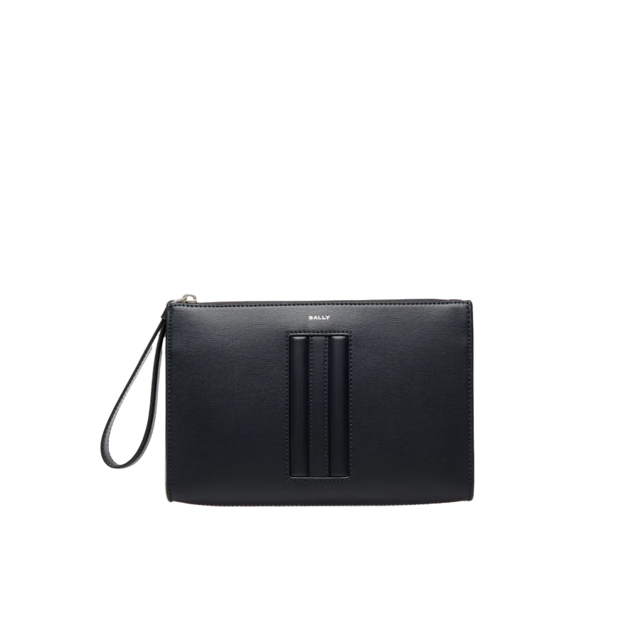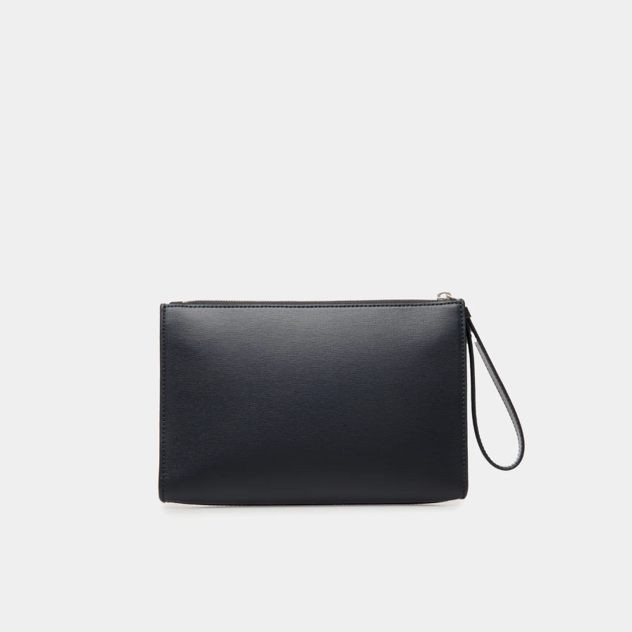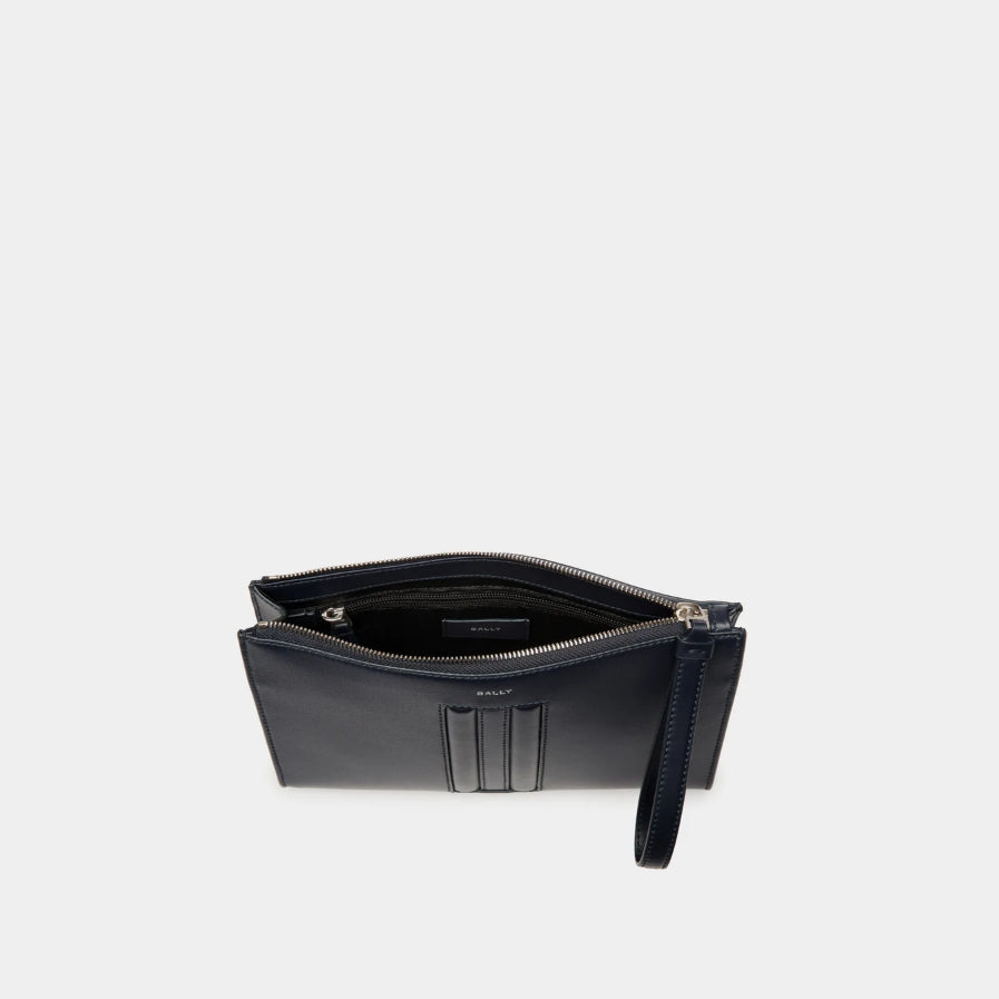 This Mythos pouch is designed into a classic silhouette and crafted from navy blue recycled leather. The wrist loop doubles as the puller of the zipper along the top, in leather that matches the intarsia Bally Ribbon at the front.