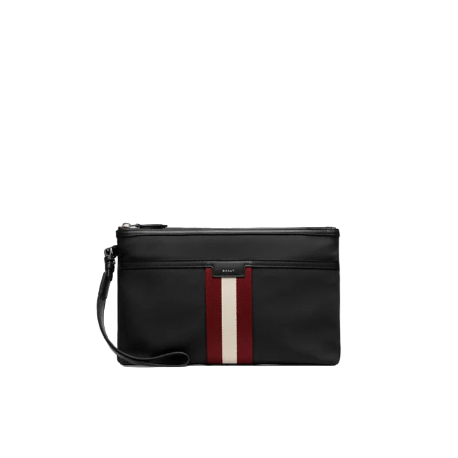 This black nylon Code pouch is decorated by a red and white Bally Ribbon at the front and finished in leather trim. A palladium-hue metal zipper closes the top. A leather loop allows this pouch to be carried as a wristlet or by hand.